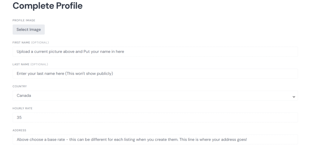 - Select a base hourly rate – once your profile is complete and you’ve connected a payment method you will be able to list multiple listings and have different hourly rates for each if you’d like, so this is just your default rate.