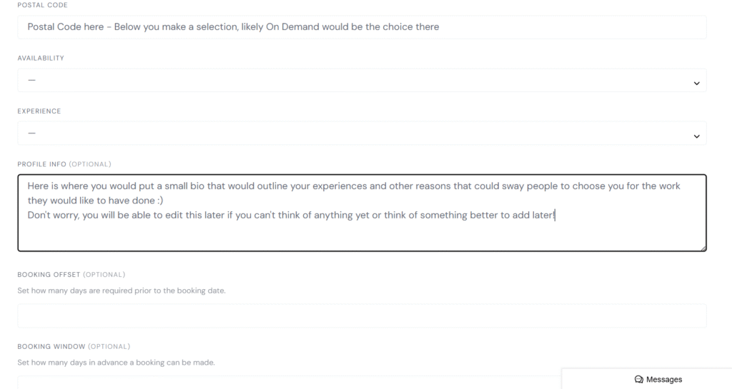 - Fill in Profile Info – This is a little about you that people will see when they are deciding who to hire. It is a great way to list some experiences and sway people as to why you would be best for the job!