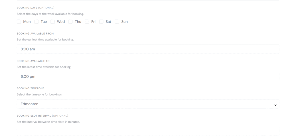 - Booking Timezone, for example if you’re in Alberta select Edmonton.